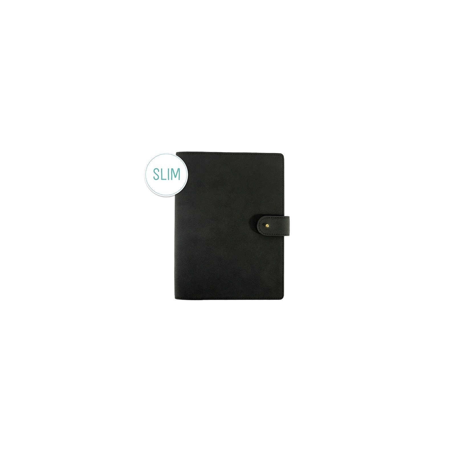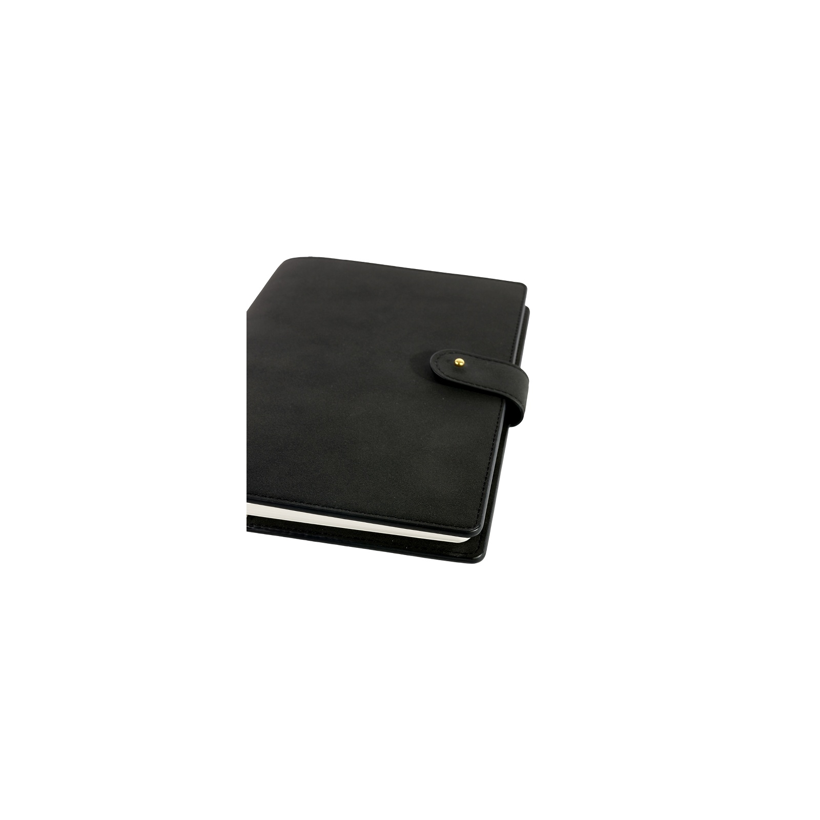 Märkmiku musta tooni polüuretaannahast kaaned on viimistletud nubukile iseloomuliku sametiselt pehme pinnaga, mida täiendavad elegantsed kuldsed detailid ja praktiline nööpkinnitus.