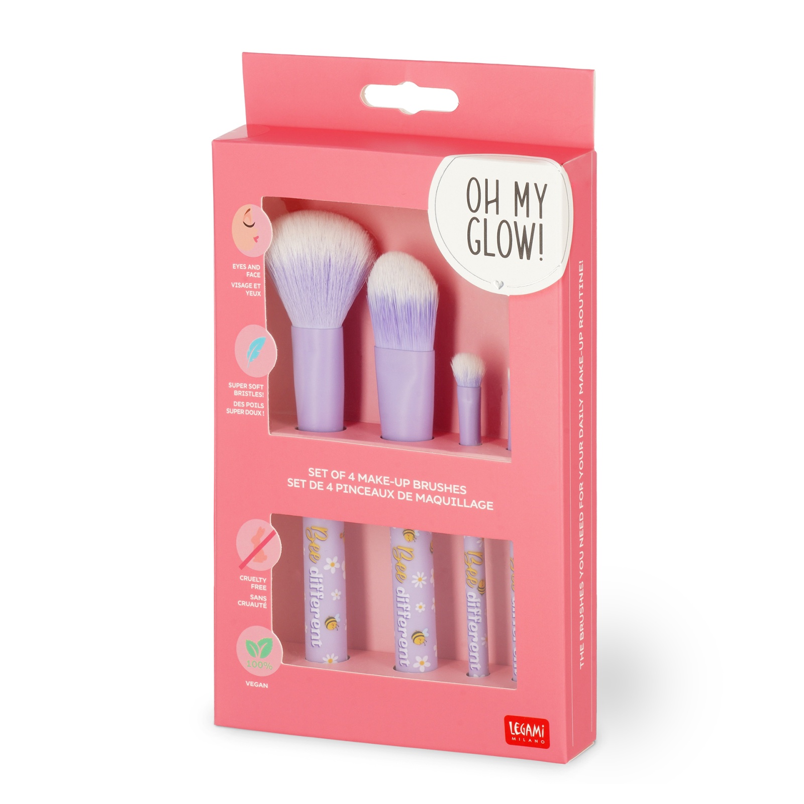 Nüüd saate suurepäraselt meigi peale kanda Legami 4 meigipintsliga Oh My Glow!, millest igaühel on oma spetsiifiline kasutusala. Komplektis on suur puudripintsel, keskmine lame jumestuspintsel, üks silmapliiats täpseteks tõmmeteks ja teine kõige glamuursemate toonide hajutamiseks.