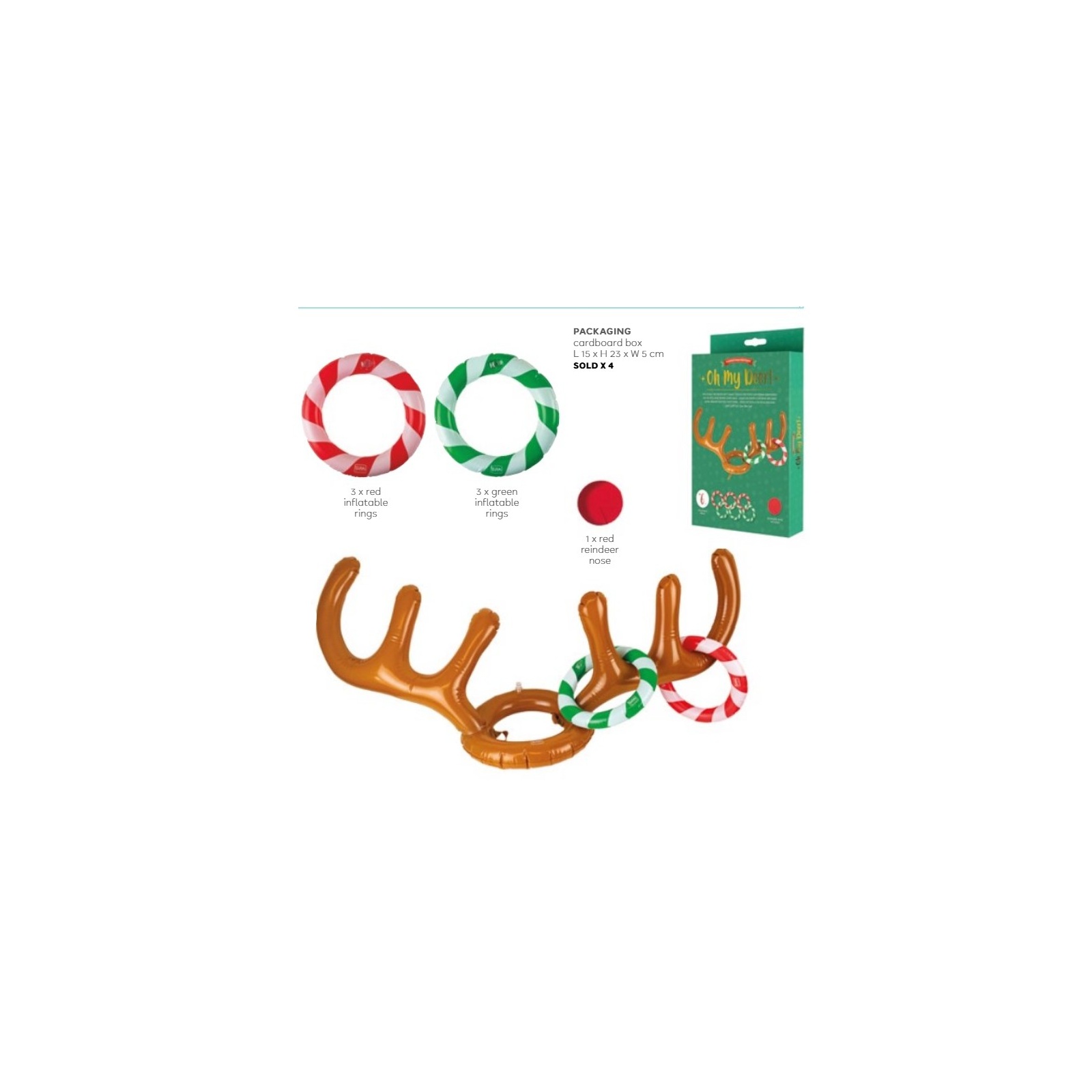 • Sisaldab: täispuhutavad põhjapõdra sarved, 6 täispuhutavat rõngast kahes värvitoonis(3punast, 3 rohelist), 1 punane põhjapõdra nina