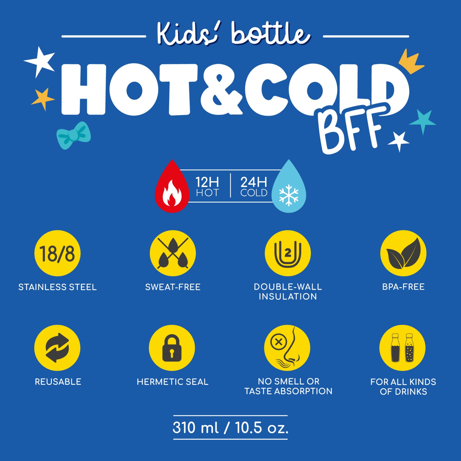 See laste termospudel on valmistatud kahekordsest 18/8 roostevabast terasest ning mahutab 310 ml. Pudelil on hermeetiliselt suletav silikoonist kork ja eemaldatav silikoonkäepide mugavaks kandmiseks.