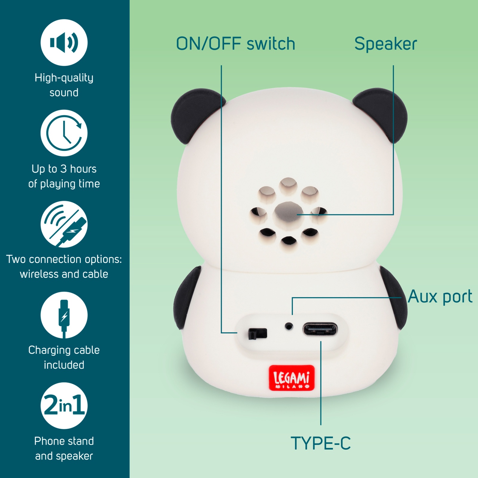 Legami juhtmevaba kõlar koos mobiilihoidjaga Panda kujundusega: